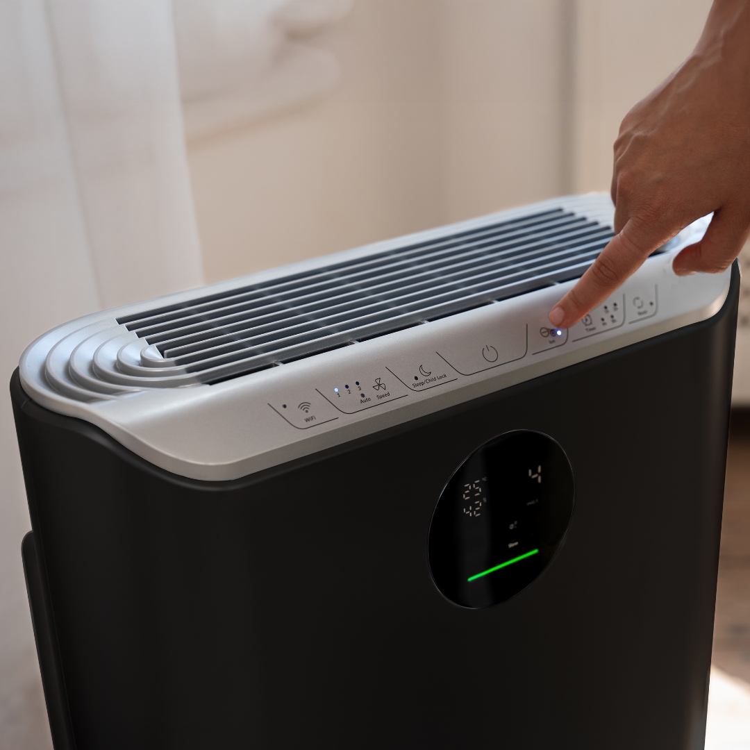 Ulepszona, 3 generacja oczyszczacza Klarta Stor w czasie rzeczywistym skanuje powietrze, natychmiast informując o poziomie PM2,5, temperatury i wilgotności. Dzięki wydajnemu, energooszczędnemu silnikowi DC, zaciąga znaczne masy powietrza do oczyszczacza.
