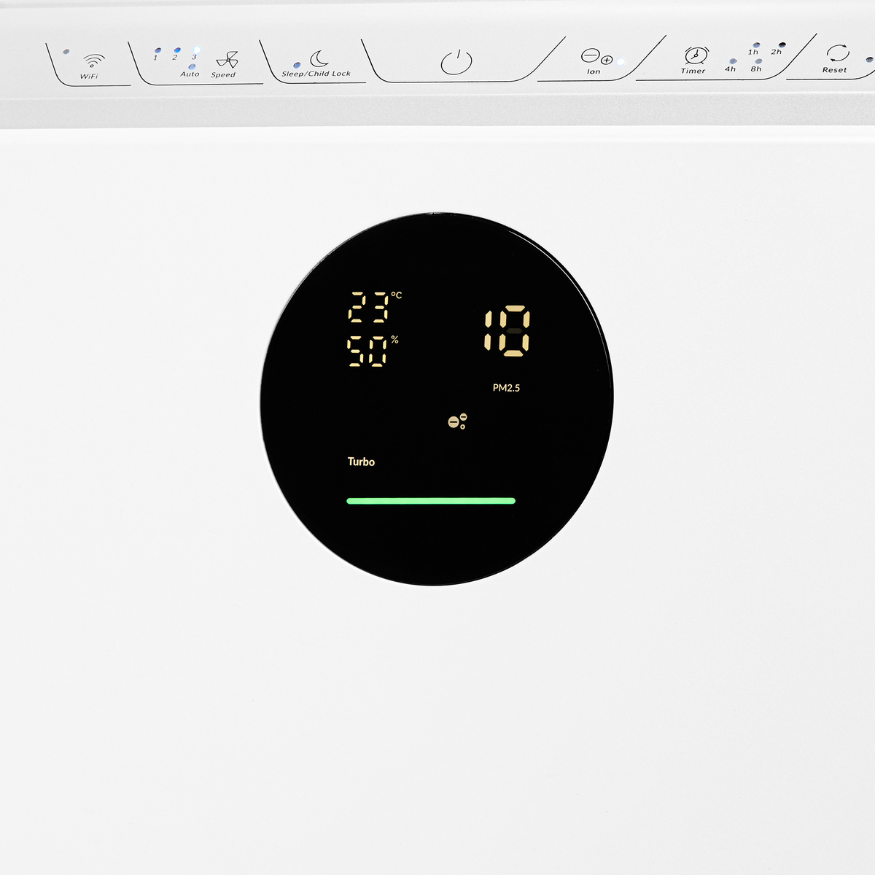 Szybki rzut oka i wszystko wiesz! LEDowy wyświetlacz z cyfrowym wskaźnikiem informuje na bieżąco o poziomie PM2,5, wilgotności oraz temperatury powietrza w pomieszczeniu.